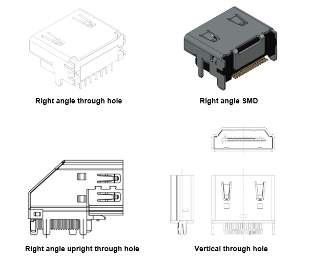 Various options are available for an HDMI connector which include right angle, right angle upright, and vertical mating orientation. Through hole and surface mounted (SMD) contact tail types are available for cable or board mounting.
