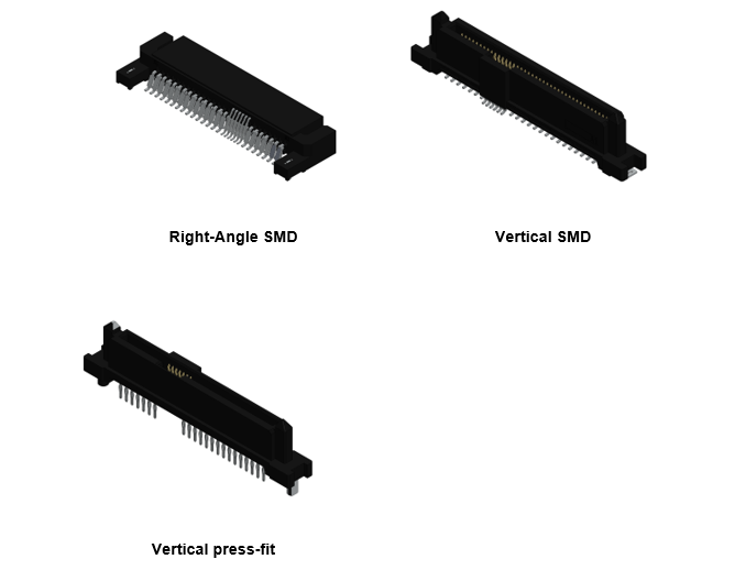High-speed edge connectors are compliant with interface standards, PCIe (peripheral component interconnect express) and SAS (serial attached SCSI), and are available in vertical or right-angle orientations with SMD or press-fit terminations.