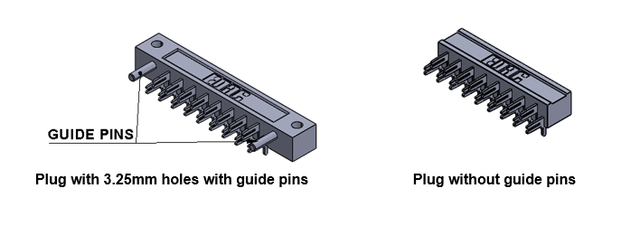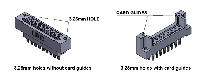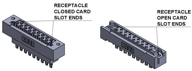 The plug and receptacle are designed to accept PC card thicknesses of 1.57mm or 2.36mm. The receptacle is available with an open or closed card slot and card guides are an option to help facilitate the mating plug connector and PCB. Receptacles are available with various termination options (PC tail, wire hole, crimp, wire wrap) for board- to-board or wire-to-board connection.