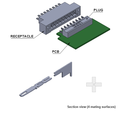 Metal-to-metal card edge connectors are a high reliability interconnect solution for applications where high shock and vibration resistance is required. Plug and receptacle connectors mate together to provide a board-to-board or wire-to-board connection. The hermaphroditic contact mating design incorporates four mating surfaces and ensures a gas tight connection.