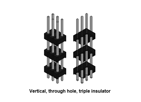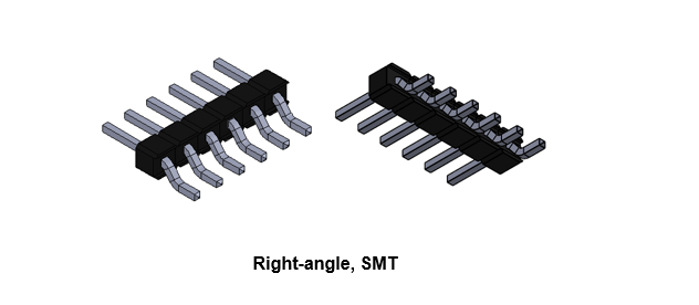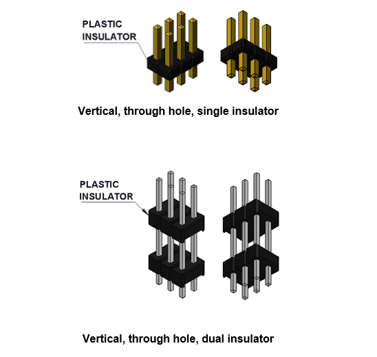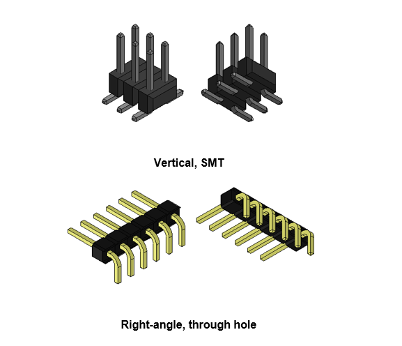 Pin header connectors are available in vertical or right-angle orientations. Common pitch options are 1.00mm, 1.27mm, 2.00mm, and 2.54mm. These connectors can be supplied with PC tail (through hole) or SMT (surface mount) terminations. Alignment posts help to facilitate placement of SMT parts onto the PCB prior to soldering. Single, dual, or triple insulators options are available.