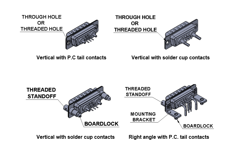 Power combo D-sub connectors are available in vertical or right-angle orientations, with PC tail or solder cup terminations. Power contacts are available in 10, 20, 30, or 40 amp versions and coaxial contacts with 50 or 75 ohm impedance ratings. Various mounting options for panel mount or connector mating include through holes, threaded holes, with or without standoffs, and with or without boardlocks. Waterproof versions are also available.