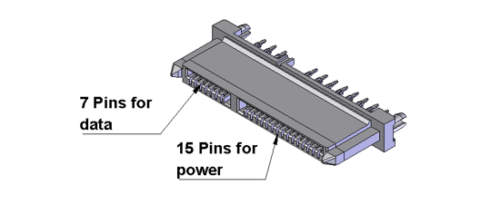 A SATA (Serial AT Attachment) connector is used as an interface for connecting a host bus adapter to mass storage devices such as hard disk drives, optical drives, and solid-state drives. Although SATA connectors look like a single port connector, SATA has two ports, one for data (7 pins) and one for power (15 pins).
