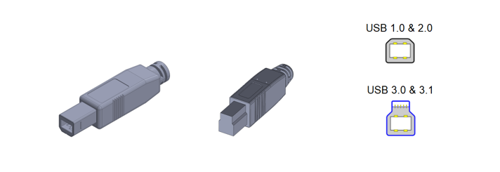 Square shaped, the USB type B is frequently utilized to connect a computer to a printer, scanner, or similar equipment. Generation 1.0 and 2.0 plugs (male) are compatible with generation 1.0, 2.0, 3.0 and 3.1 receptacles (female). 3.0 and 3.1 plugs are only compatible with 3.0 and 3.1 receptacles.