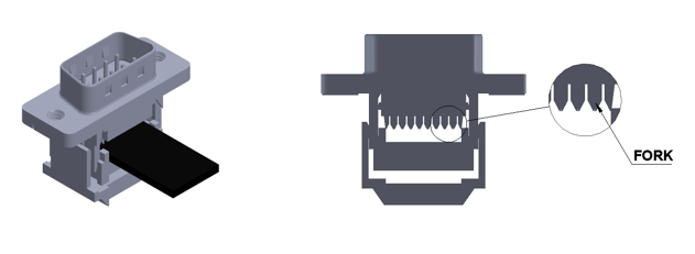 I.D.C. (Insulation Displacement Contact) connectors are designed to be connected to the conductor(s) of a flat cable. The flat cable is pressed against the contacts, the rear of which is fork-shaped, which then pierce the insulation of all the wires simultaneously. The picture below shows an I.D.C. D-sub male connector. Various I.D.C. connector types are available (ex. Dip connector, D-sub, socket header).